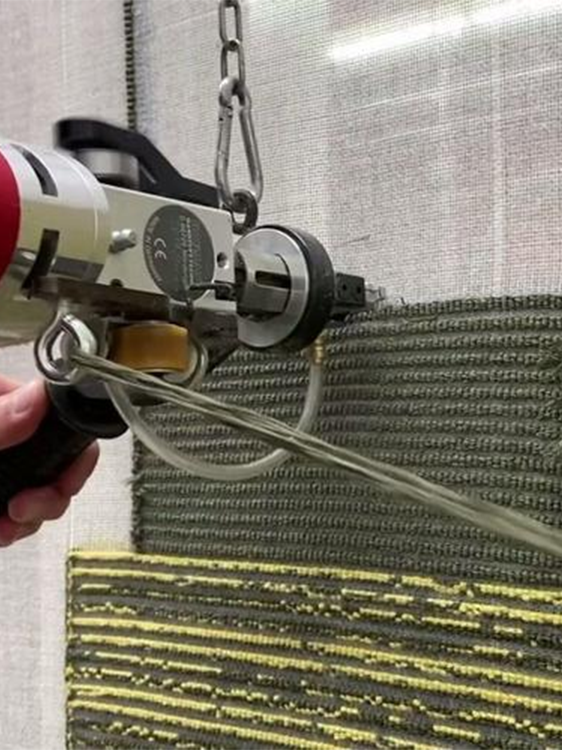 Once the inked canvas and dyed yarn preparation stages are complete, the carpet is created by skilled artisans with many years of training in the hand-tufting process. The canvas is stretched vertically, and the artisans use special hand-tufting guns designed byHouseoon to apply the yarns to the canvas, with each colour applied individually in turn.